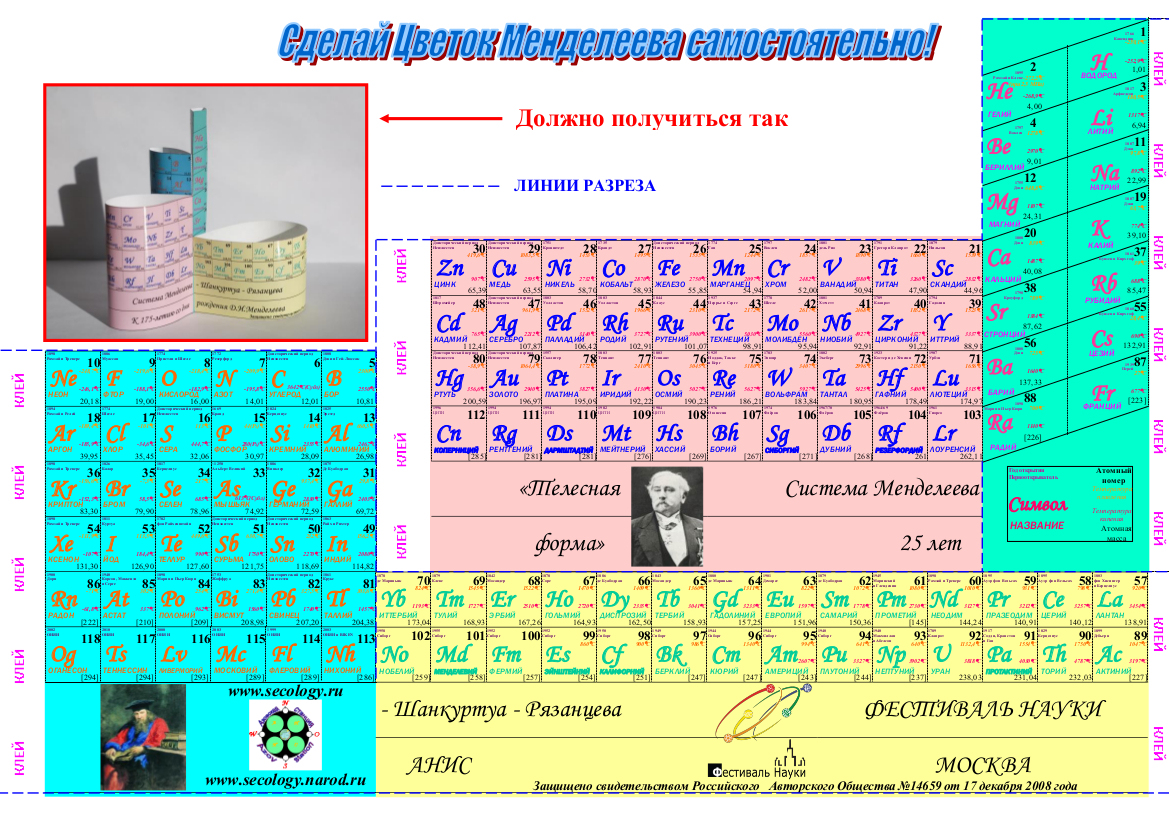 Отдадим же должное основному Эвристическому принципу Д.И.Менделеева и последуем за ним! Забудем про группы, не будем спорить, с чего начинаются периоды, а просто последовательно и непрерывно выстроим все элементы в один ряд в порядке возрастания и закрутим этот ряд в пространственную спираль, в«телесную форму, допускающую сближение» подобных химических элементов по вертикали!